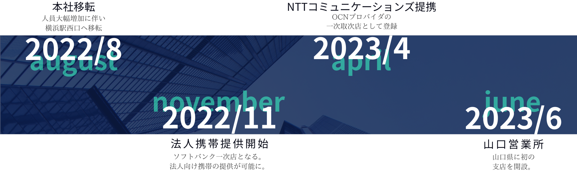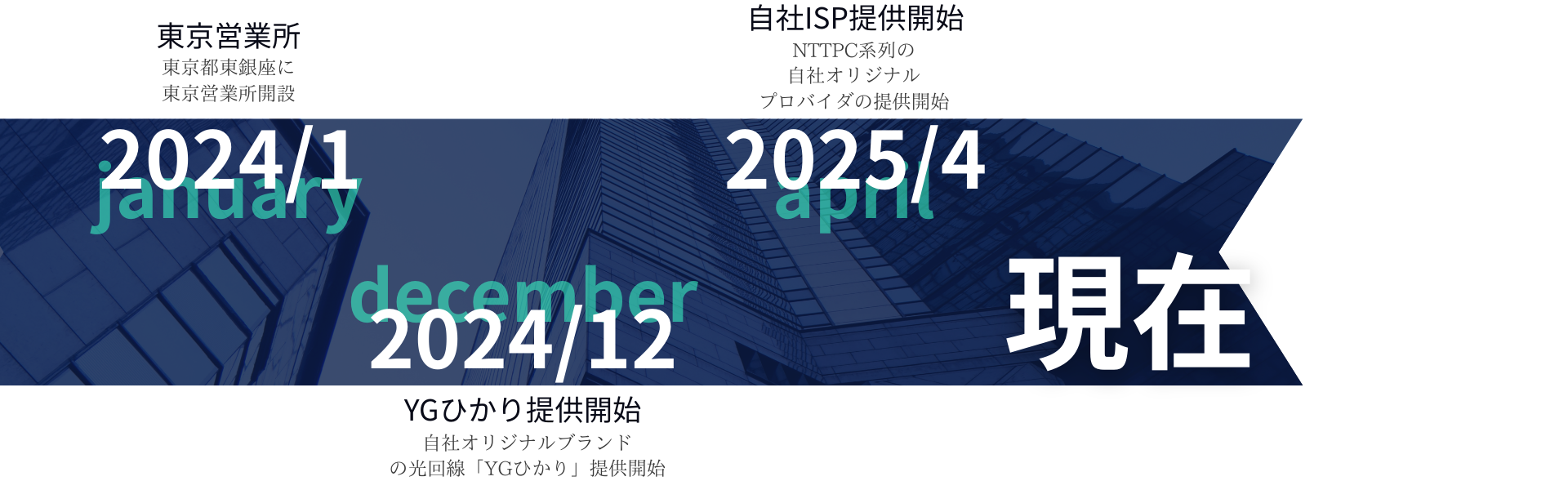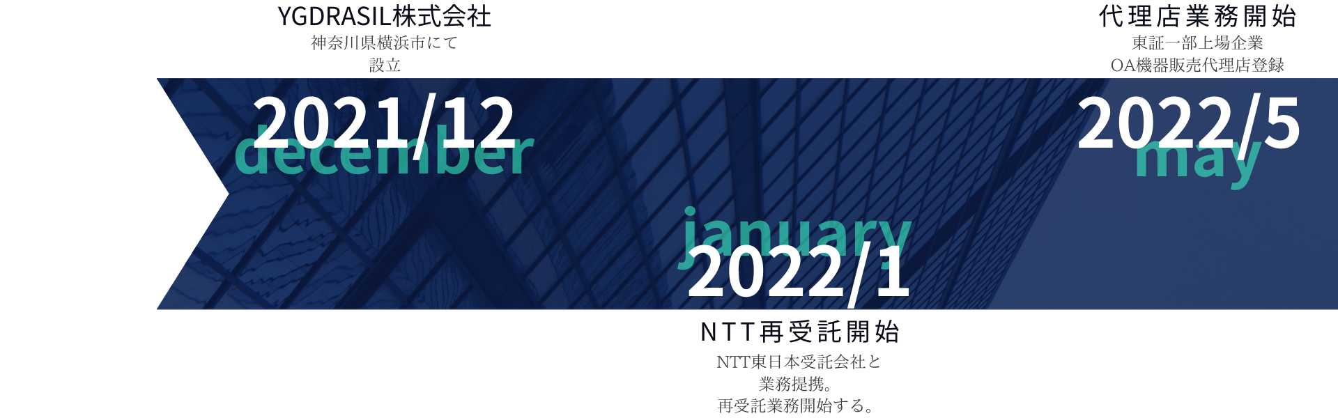 設立からの年月はまだ浅いものの、私たちは現場での一つひとつの実績を大切に積み重ねてきました。お客様の課題に真摯に向き合い、丁寧な提案と確かな技術力で信頼を獲得しています。その積み重ねが、企業としての着実な成長につながっています。これからも堅実に、そして柔軟に時代のニーズに応え続けてまいります。 会社沿革 2021.12 YGDRASIL株式会社設立 2022.1 NTT東日本再受託会社と提携 2022.5 東証一部上場企業OA機器代理店登録 2022.8 本社を現住所へ移転 2022.11 初決算初年度で売上1億達成 2023.4 NTTコミュニケーションズ一次店登録 2023.6 山口営業所開設 2024.1 東京営業所開設 2024.12 YG光提供開始